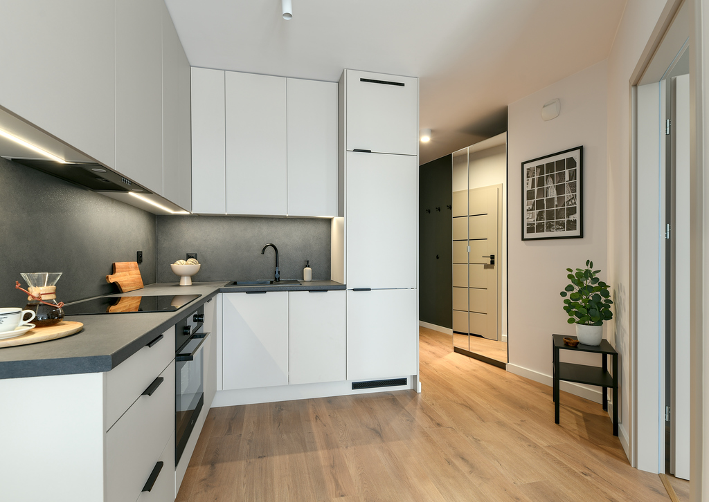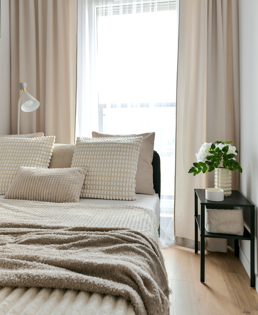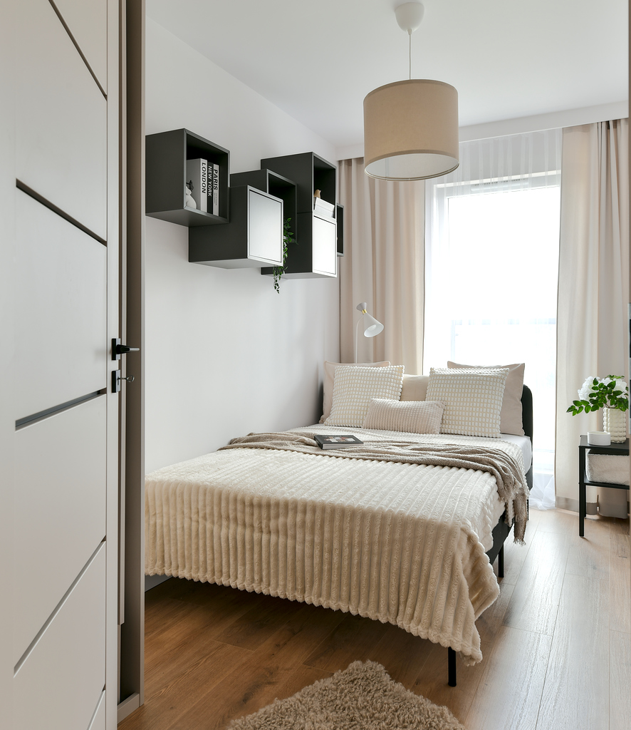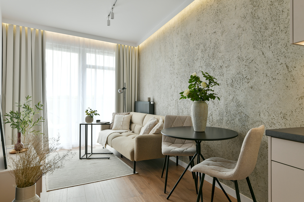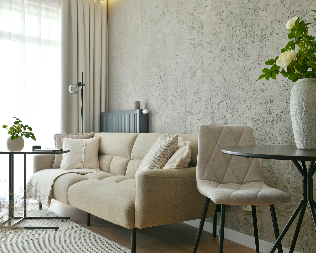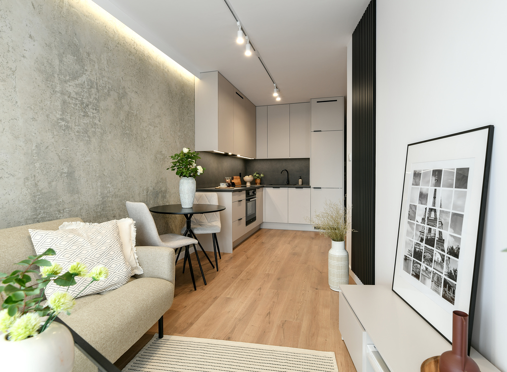 Mieszkanie przeszło dużą metamorfozę. Kawalerka o powierzchni 34 m2 została przekształcona w wygodną sypialnię oraz salon z kuchnią. Znalazło się miejsce na dwuosobowe łóżko i stylową rozkładaną sofę. W mieszkaniu panuje kolor kaszmirowy, przeplatany loftowymi akcentami – jak np. ścianą z betonu architektonicznego. Przedsięwzięcie wykonane pod klienta docelowego – od zakupu po sesję zdjęciową, poprzez projekt wnętrza, nadzór nad remontem, umeblowanie i dekoracje home stagingowe.