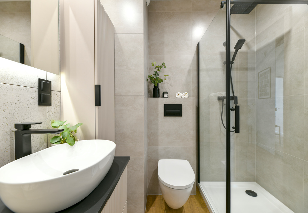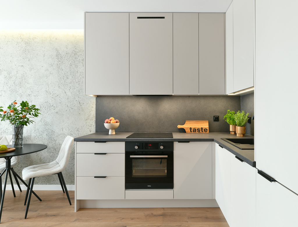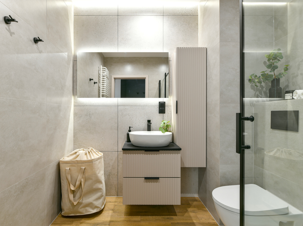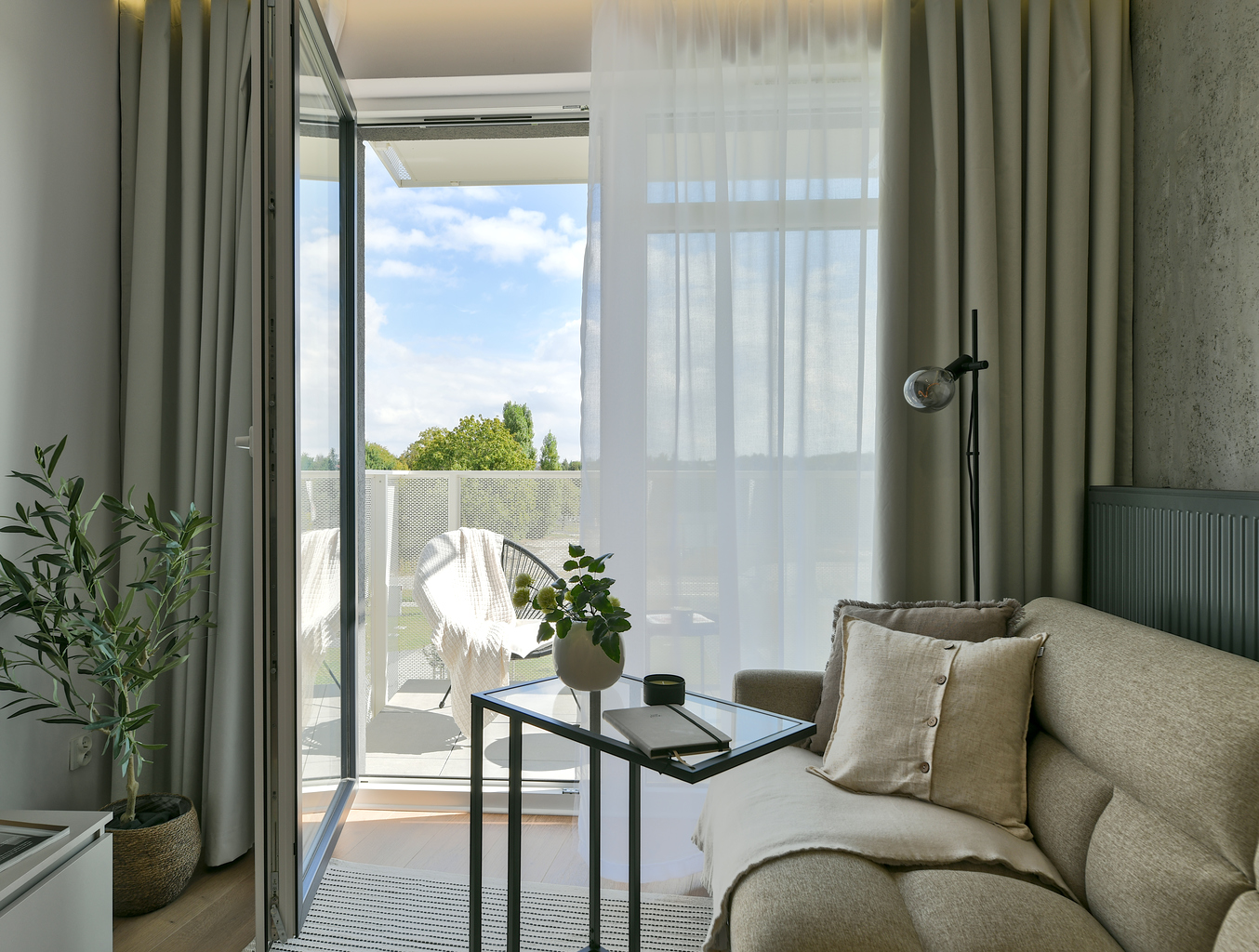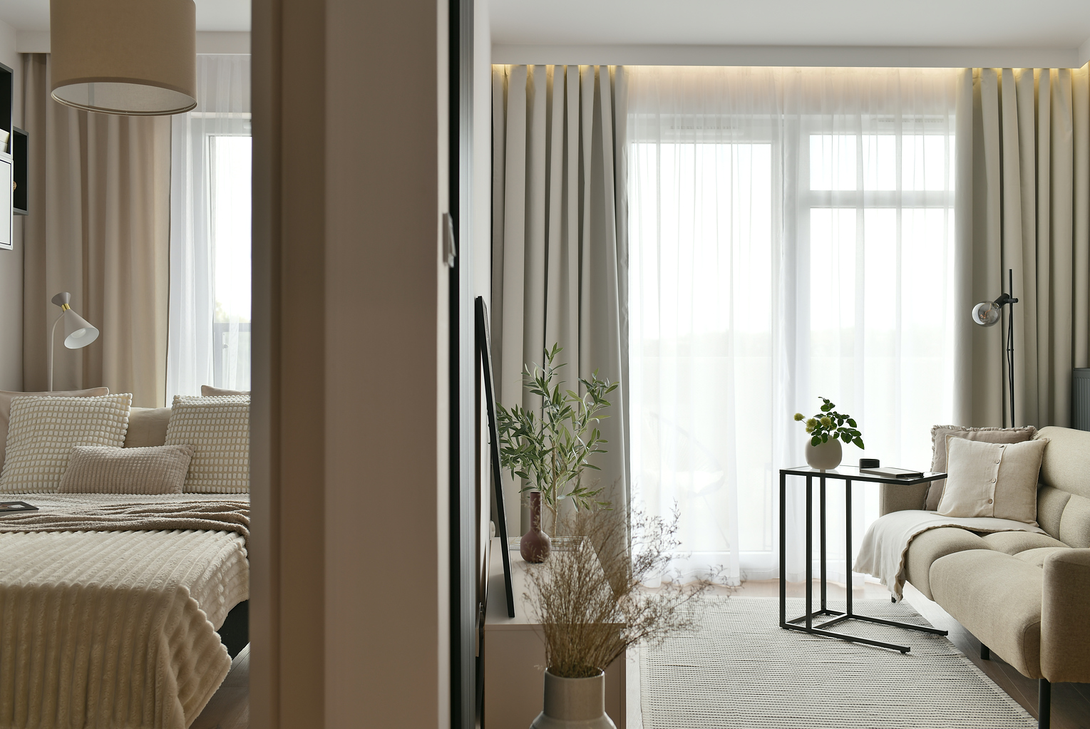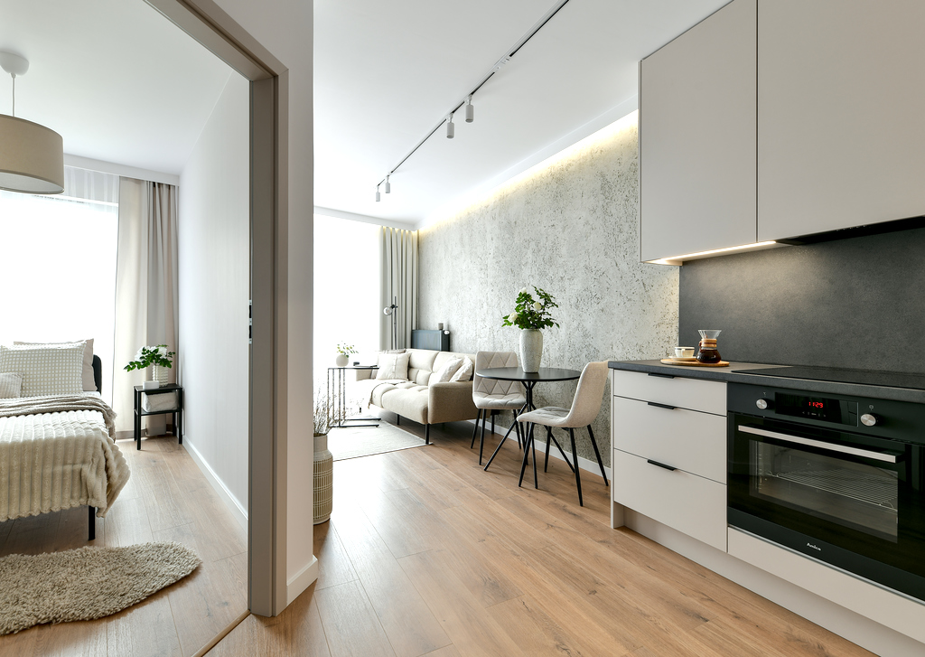 Mieszkanie przeszło dużą metamorfozę. Kawalerka o powierzchni 34 m2 została przekształcona w wygodną sypialnię oraz salon z kuchnią. Znalazło się miejsce na dwuosobowe łóżko i stylową rozkładaną sofę. W mieszkaniu panuje kolor kaszmirowy, przeplatany loftowymi akcentami – jak np. ścianą z betonu architektonicznego. Przedsięwzięcie wykonane pod klienta docelowego – od zakupu po sesję zdjęciową, poprzez projekt wnętrza, nadzór nad remontem, umeblowanie i dekoracje home stagingowe.