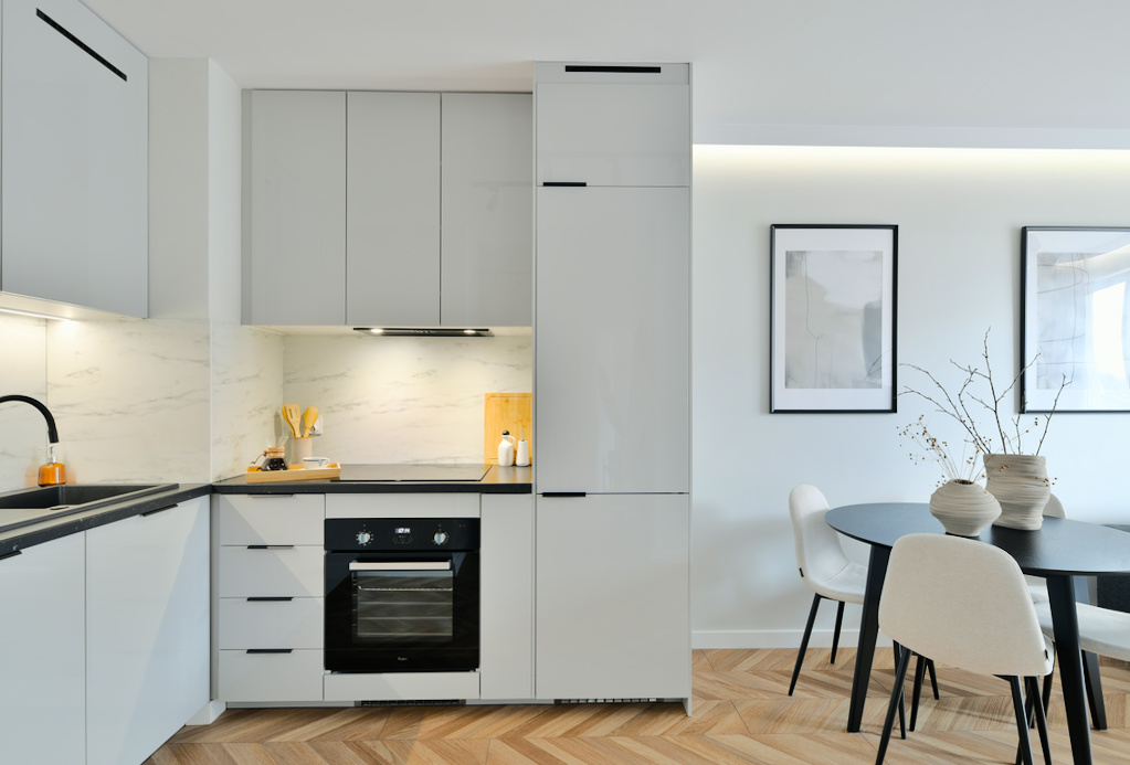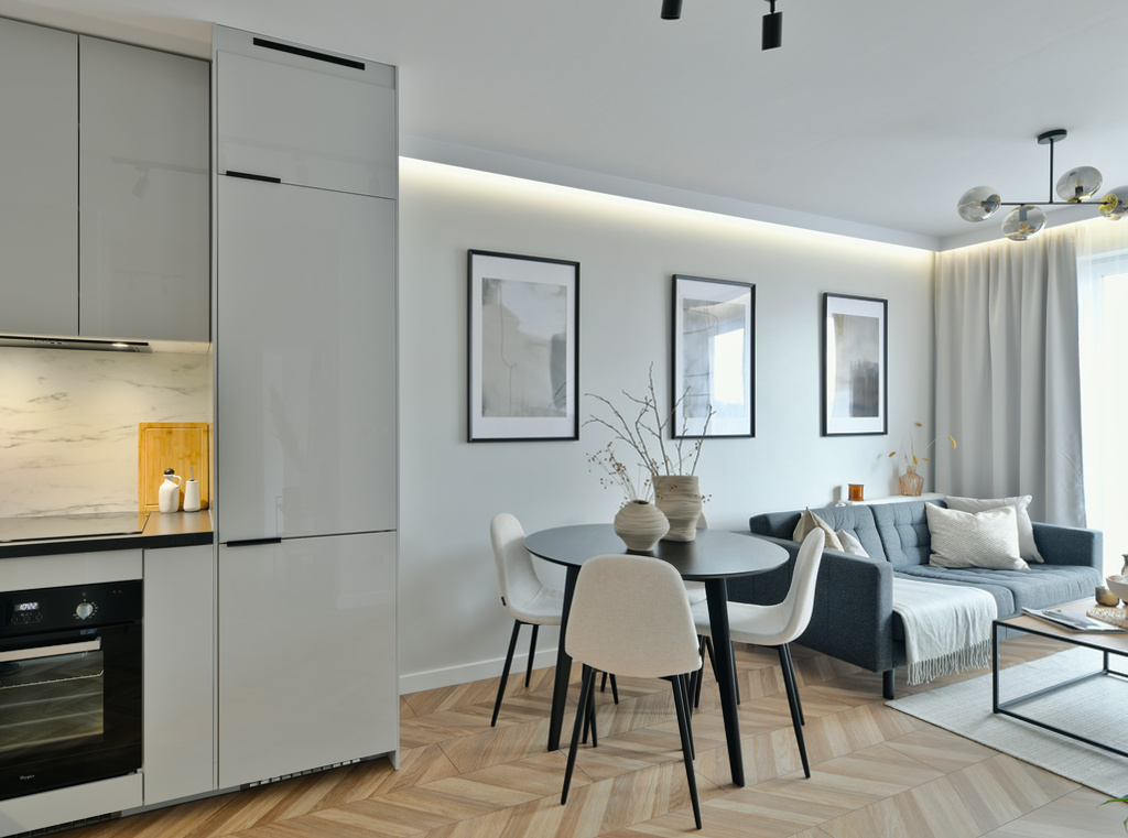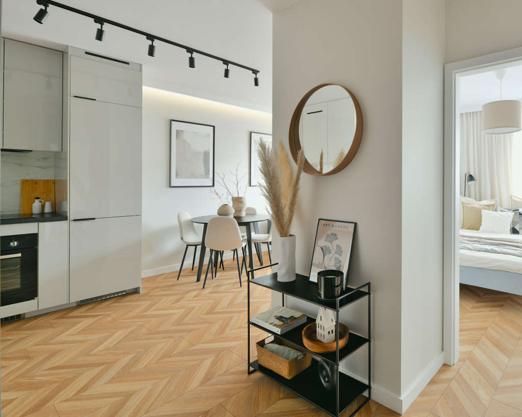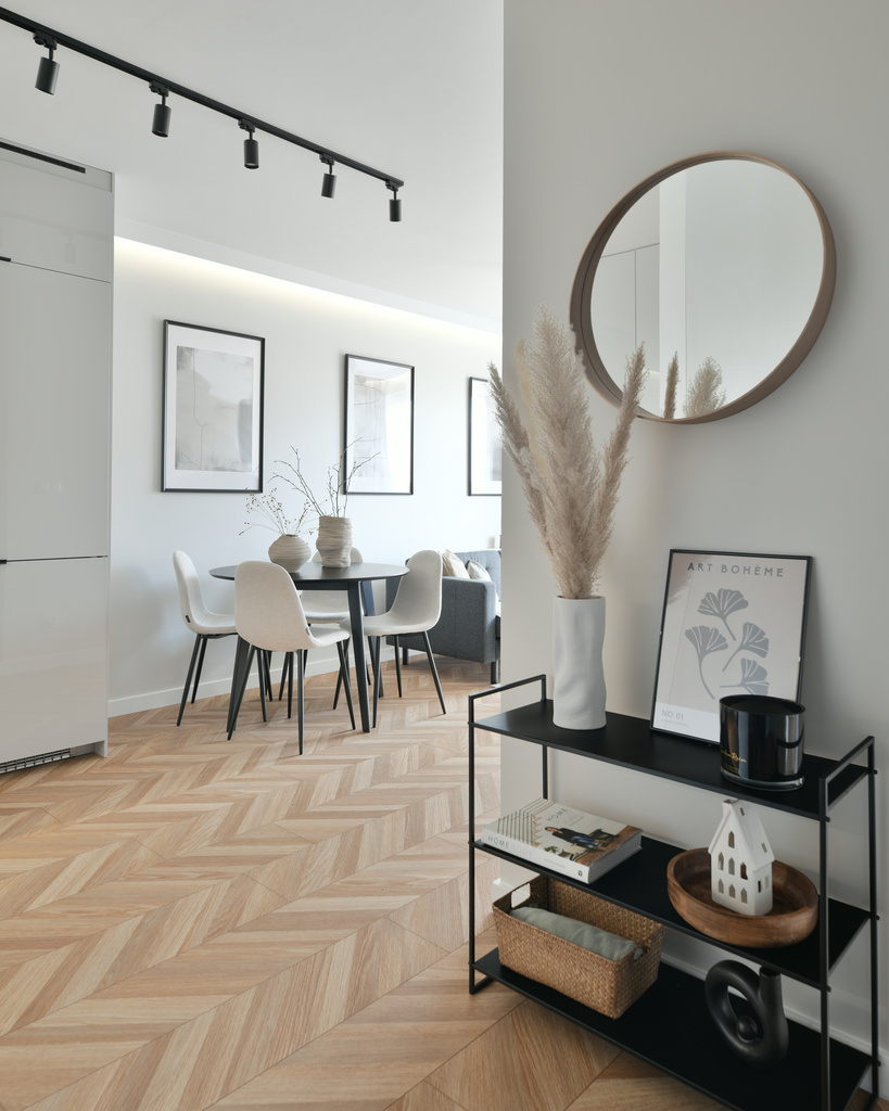 Piękne i przytulne wnętrze – trzy pokoje w Poznaniu zaaranżowane w stonowanym stylu z dużą ilością akcentów drewna, pastelowych kolorach i szarościach, przetkanych czarnymi meblami i wstawkami. Funkcjonalne i wszechstronne mieszkanie, projekt wykonany od podstaw w mieszkaniu deweloperskim, zakończony home stagingiem i sesją zdjęciową.